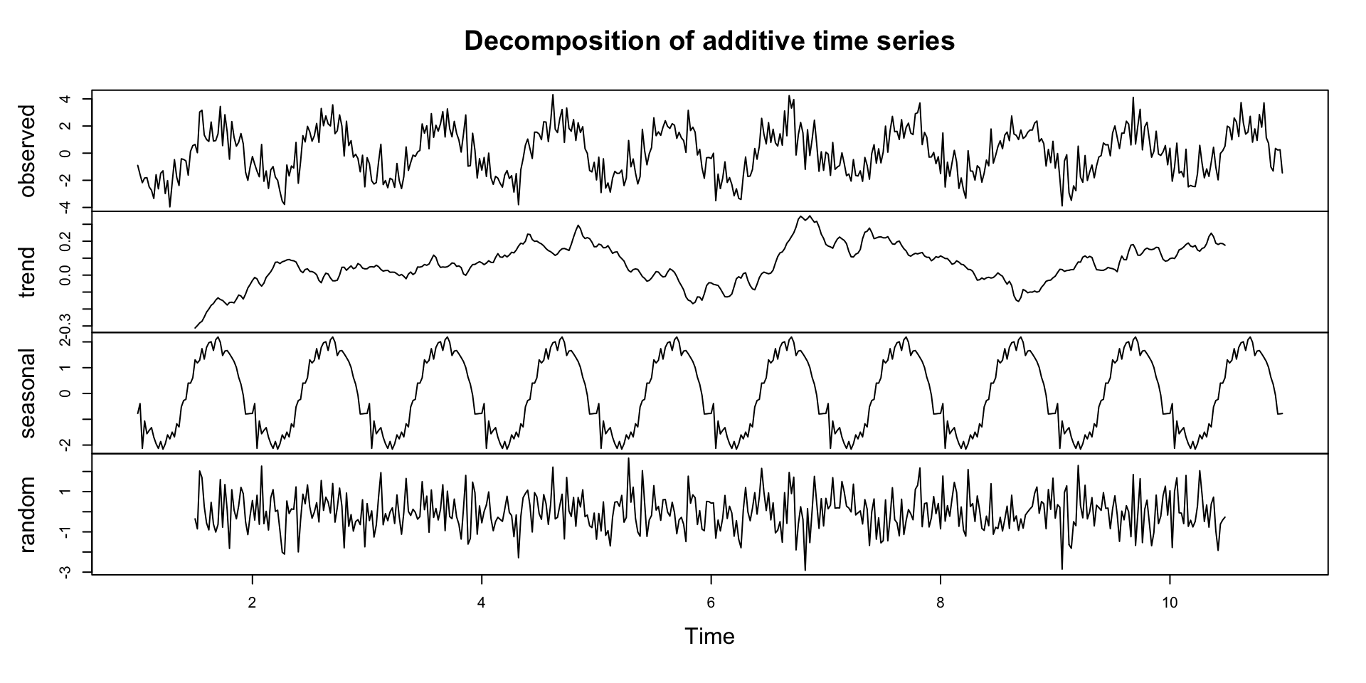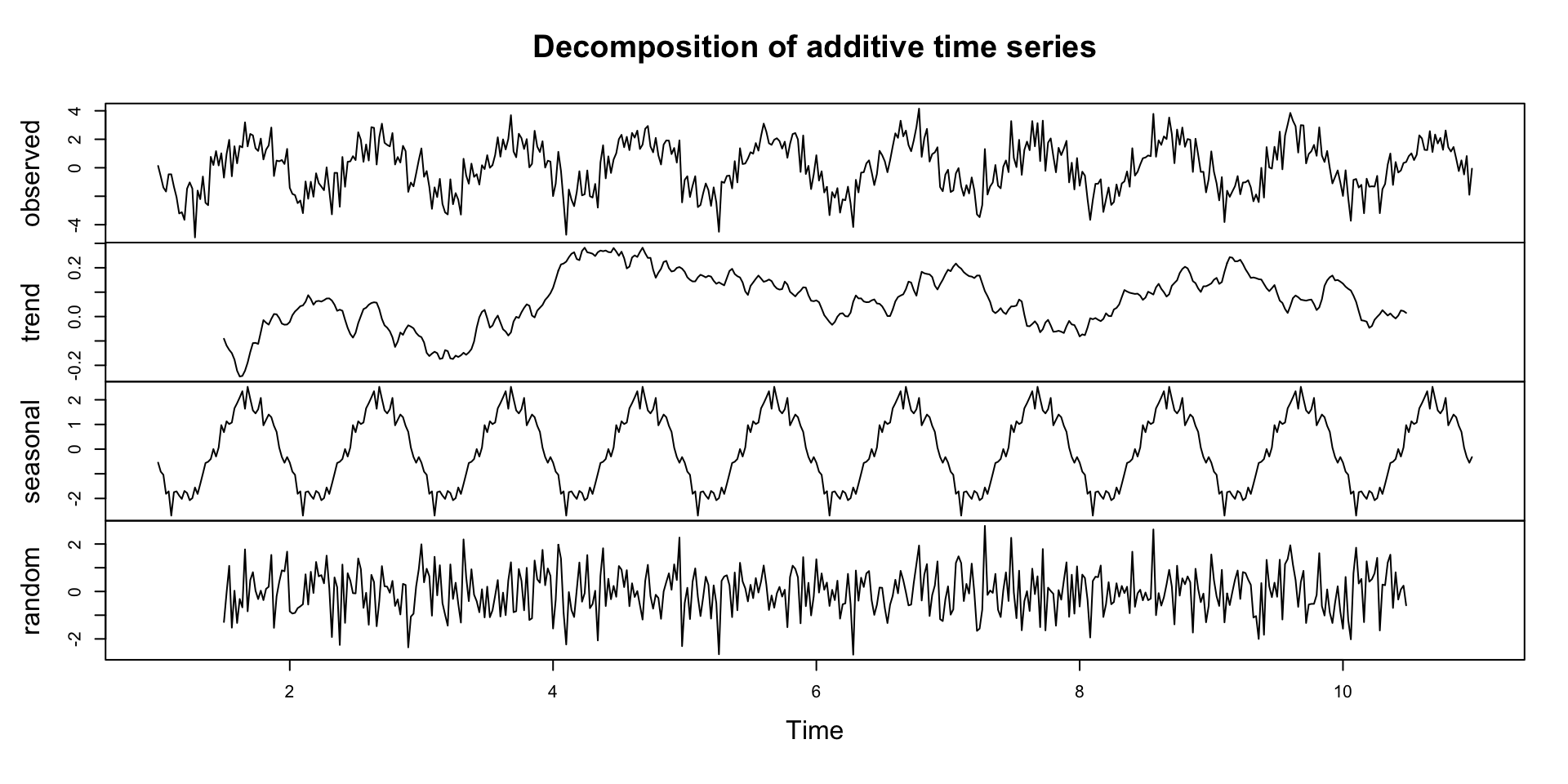 The r function stats::decompose will split a time series \(X_t\) into these three components.