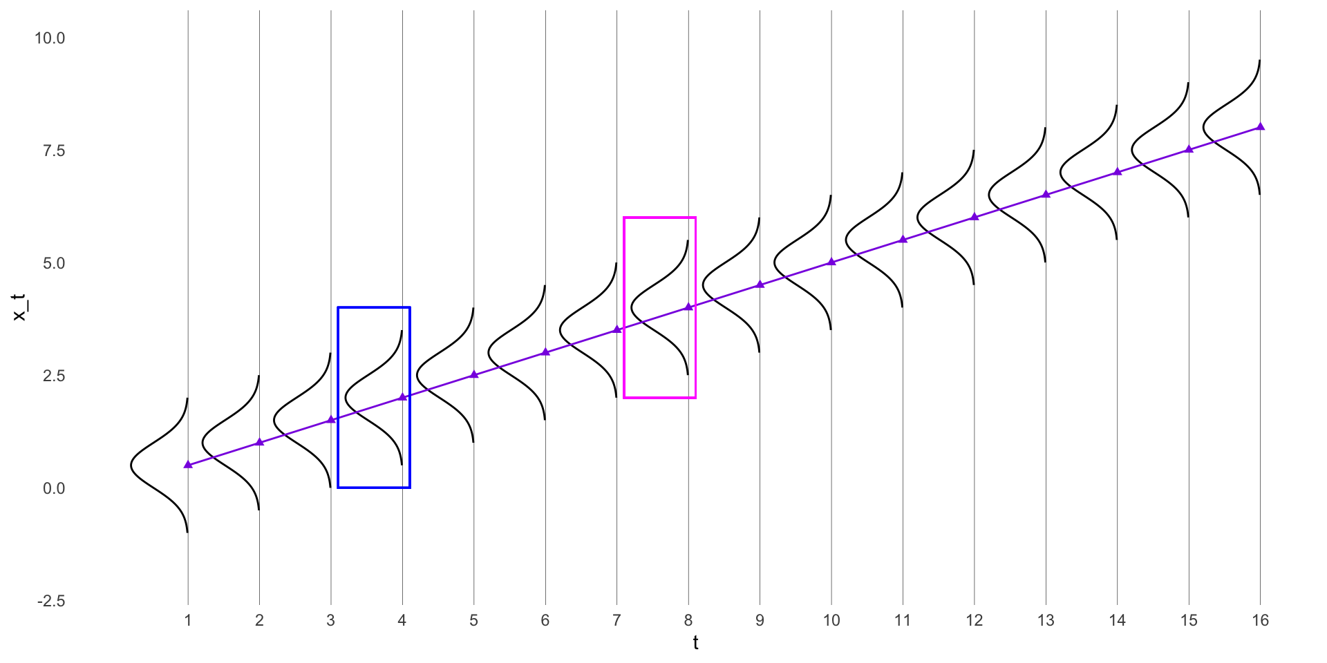 More concretely: consider if we want to know the correlation between the random walk at times \(s = 2, t = 5\), \[ \gamma(2,5) = \min\{2,5\}\sigma^2_w = 2\sigma^2_w \] But \(\gamma(3,5) = 3\sigma^2_w\). So the autocovariance is different depending on which points in time you are considering.