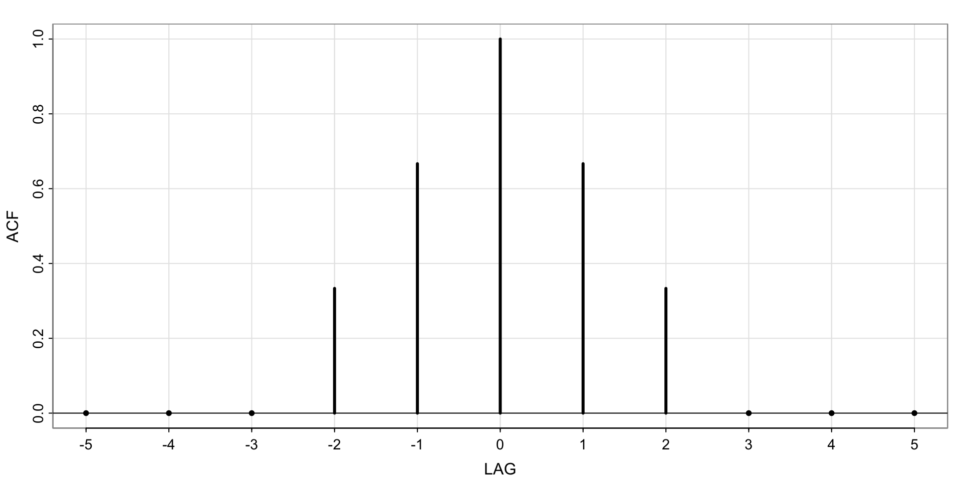 \(\gamma_v(h) = \begin{cases}\frac{3}{9}\sigma^2_w & \text{ if } h = 0\\ \frac{2}{9}\sigma^2_w & \text{ if } h = \pm1 \\\frac{1}{9}\sigma^2_w & \text{ if }h = \pm 2 \\0 & \text{ if } h> 2\end{cases}\)