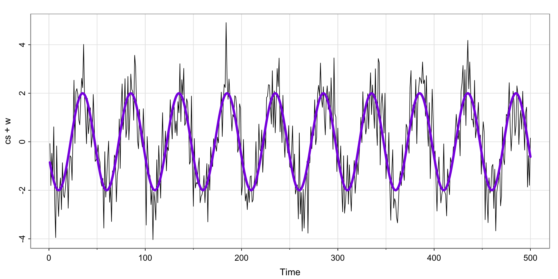 Recall the (sinusoidal) signal plus noise model: \[ w_t \sim \text{iid } N(0, \sigma^2_w)\\ x_t = 2\cos\left (\frac{2\pi t}{50} - .6\right) + w_t \]
