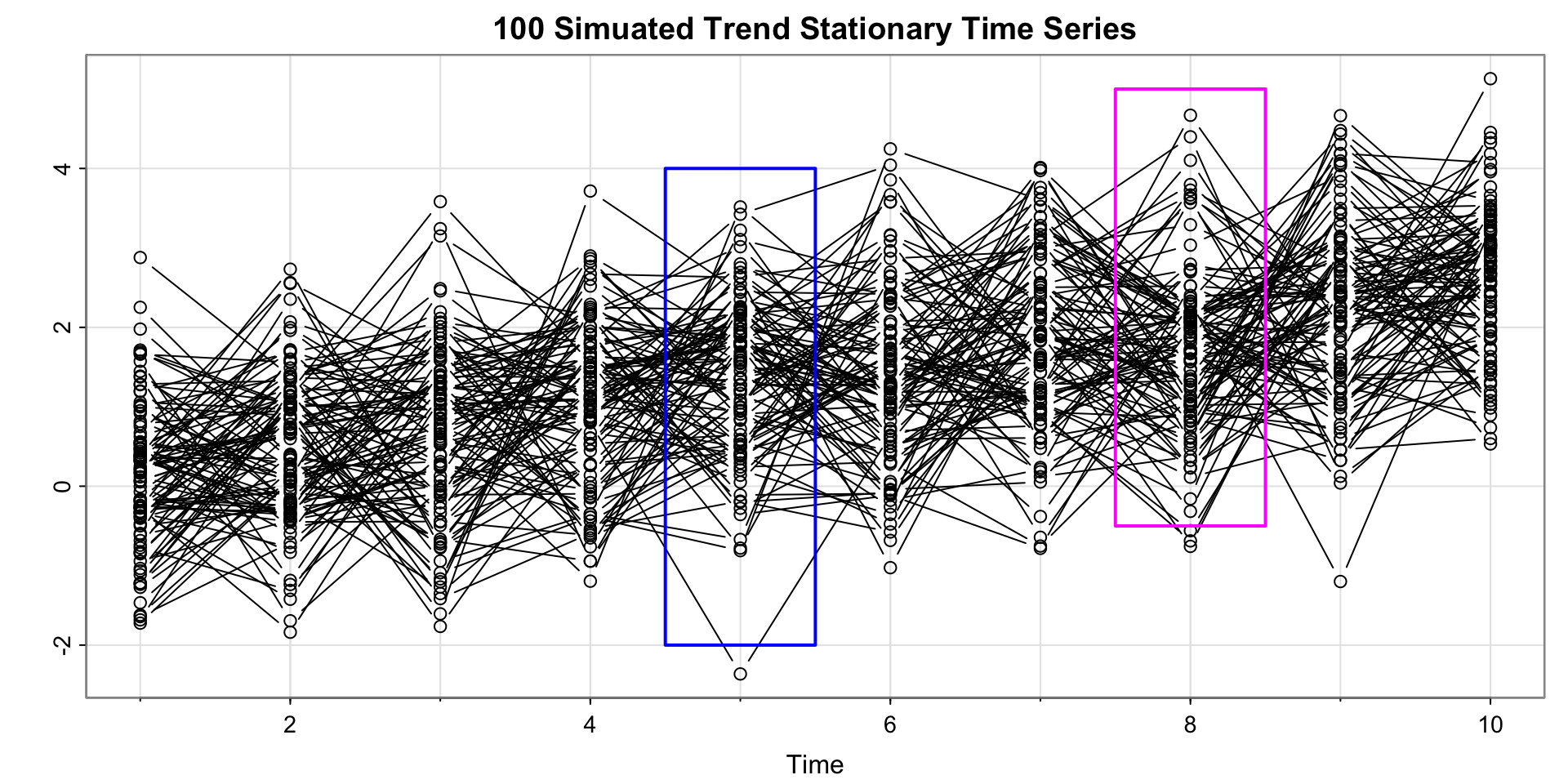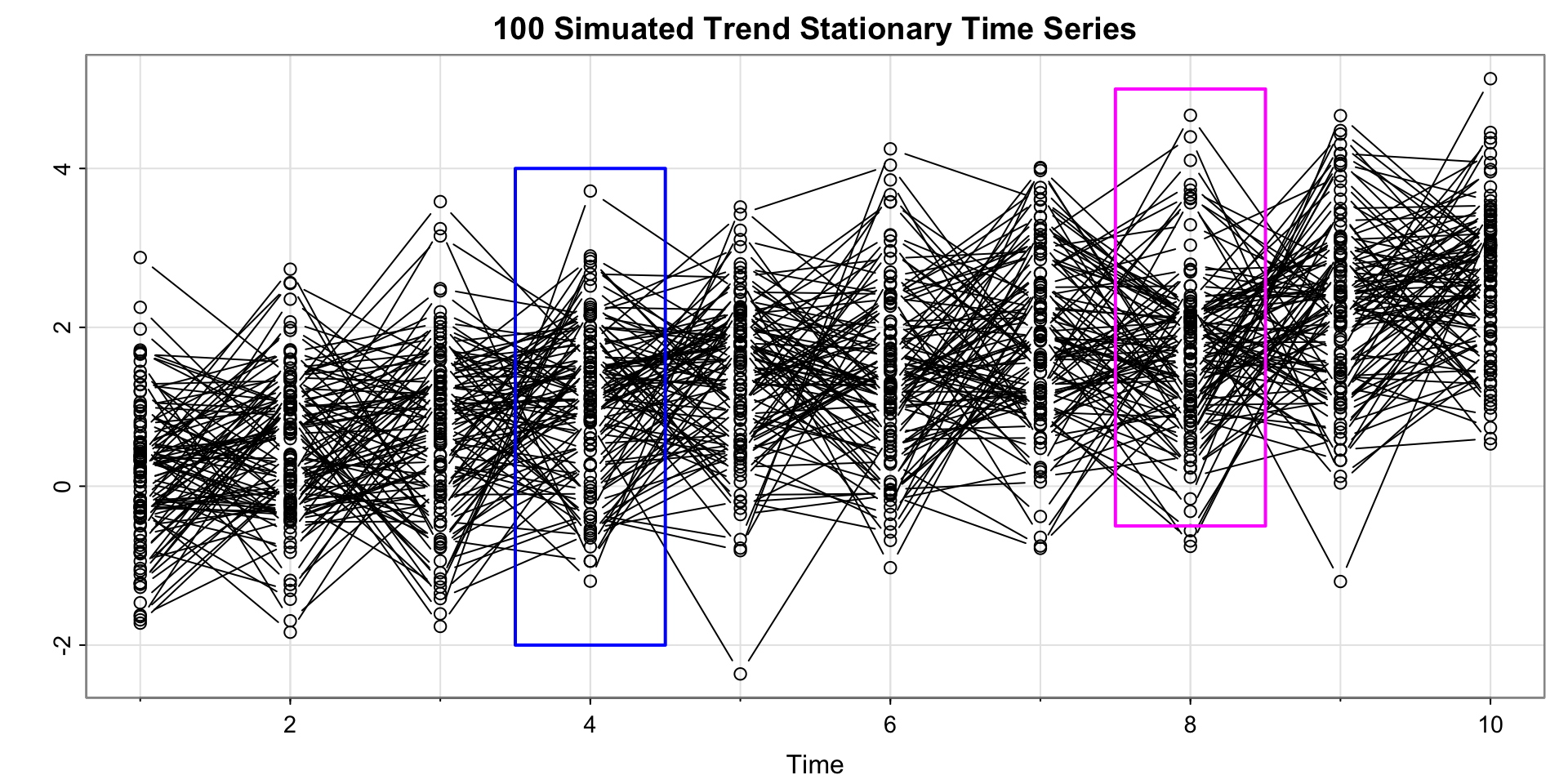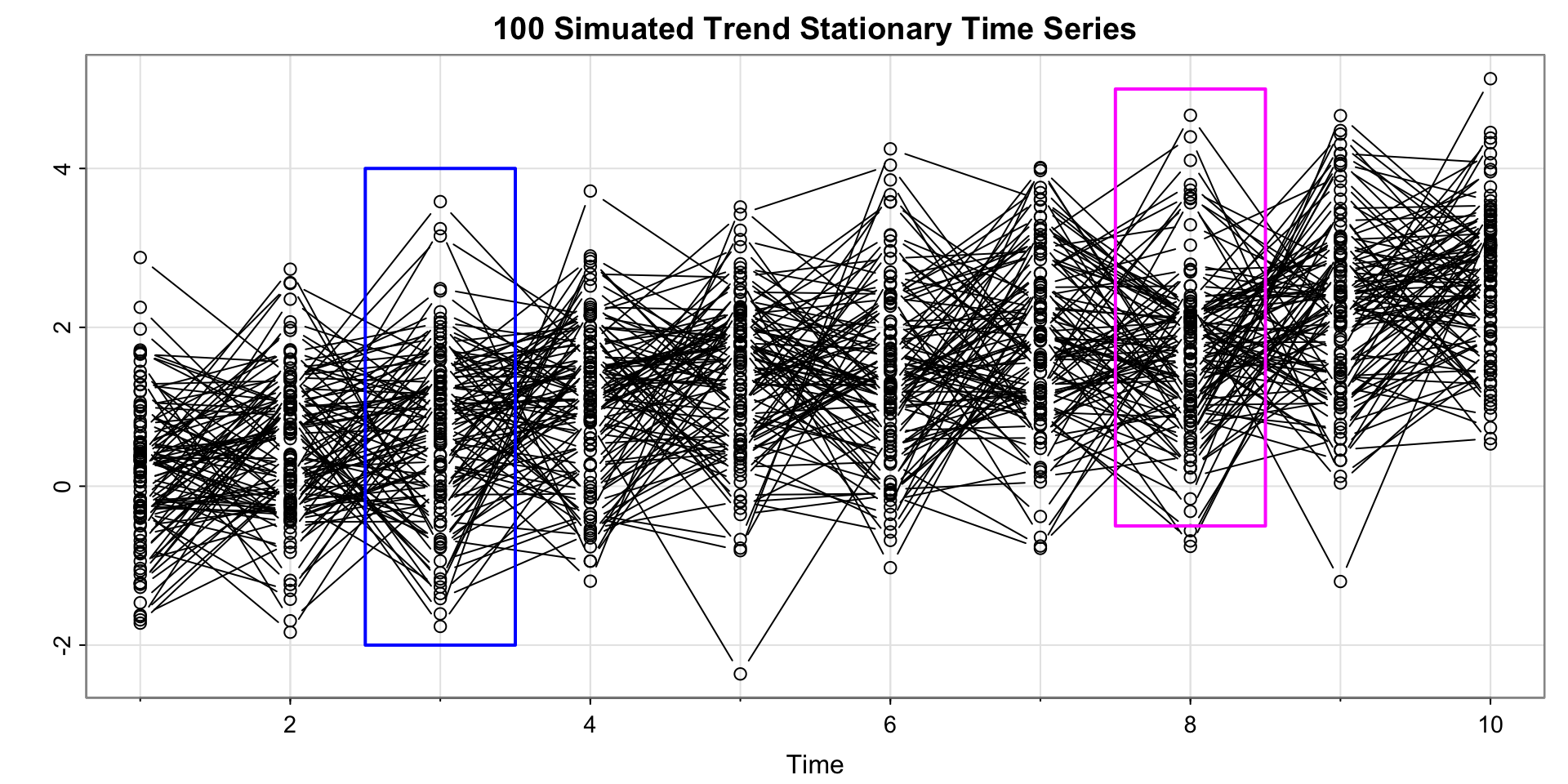 Consider the time series model \[x_t = \beta t + y_t\] Assume \(y_t\) is stationary with mean function \(\mu_y\) and and autocovariance function \(\gamma_y(h)\)