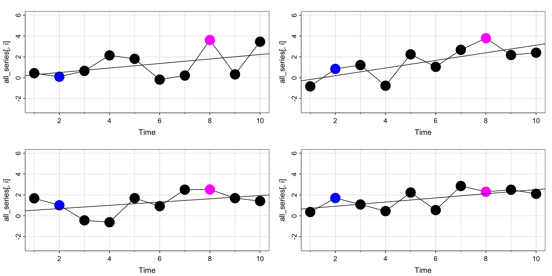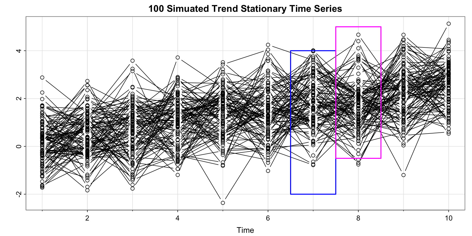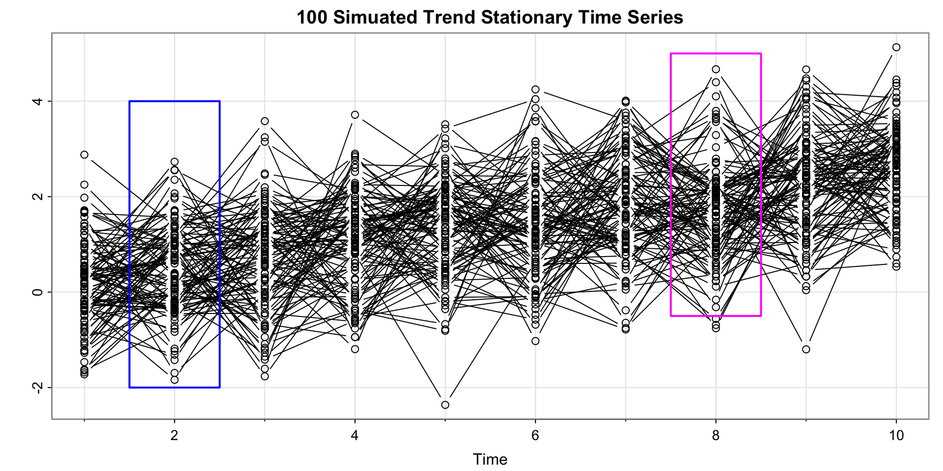 Consider the time series model \[x_t = \beta t + y_t\] Assume \(y_t\) is stationary with mean function \(\mu_y\) and and autocovariance function \(\gamma_y(h)\)