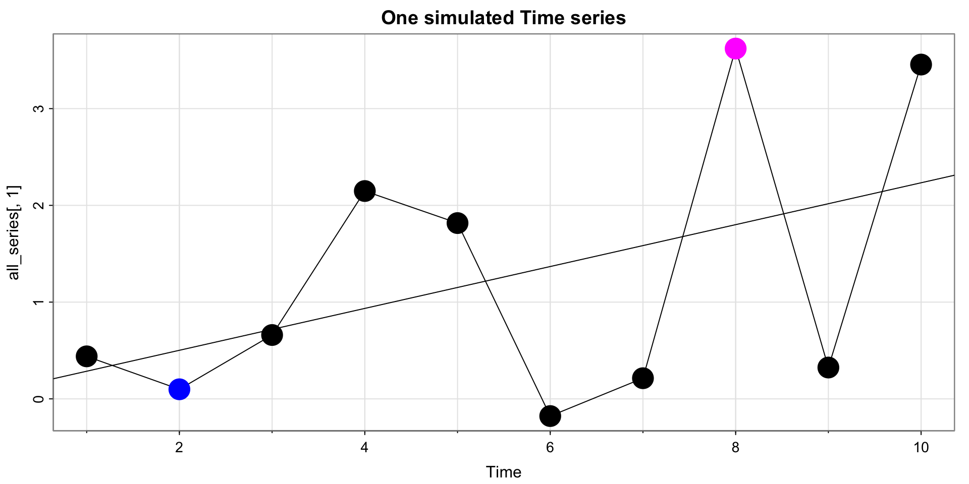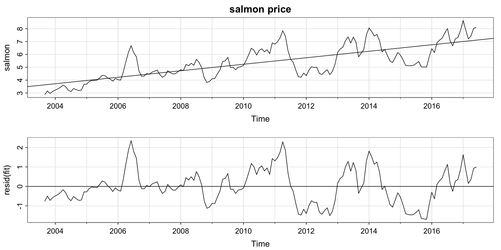 library(astsa)summary(fit <-lm(salmon~time(salmon), na.action=NULL))## ## Call:## lm(formula = salmon ~ time(salmon), na.action = NULL)## ## Residuals:## Min 1Q Median 3Q Max ## -1.69187 -0.62453 -0.07024 0.51561 2.34959 ## ## Coefficients:## Estimate Std. Error t value Pr(>|t|) ## (Intercept) -503.08947 34.44164 -14.61 <2e-16 ***## time(salmon) 0.25290 0.01713 14.76 <2e-16 ***## ---## Signif. codes: 0 '***' 0.001 '**' 0.01 '*' 0.05 '.' 0.1 ' ' 1## ## Residual standard error: 0.8814 on 164 degrees of freedom## Multiple R-squared: 0.5706, Adjusted R-squared: 0.568 ## F-statistic: 217.9 on 1 and 164 DF, p-value: < 2.2e-16tsplot(salmon, col=4, ylab="USD per KG", main="Salmon Export Price")abline(fit)